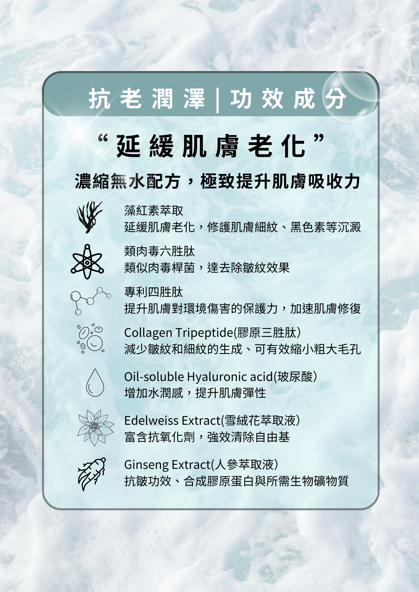 搭配藻紅素及三胜肽六胜肽,有助於撫平動靜態紋和細紋