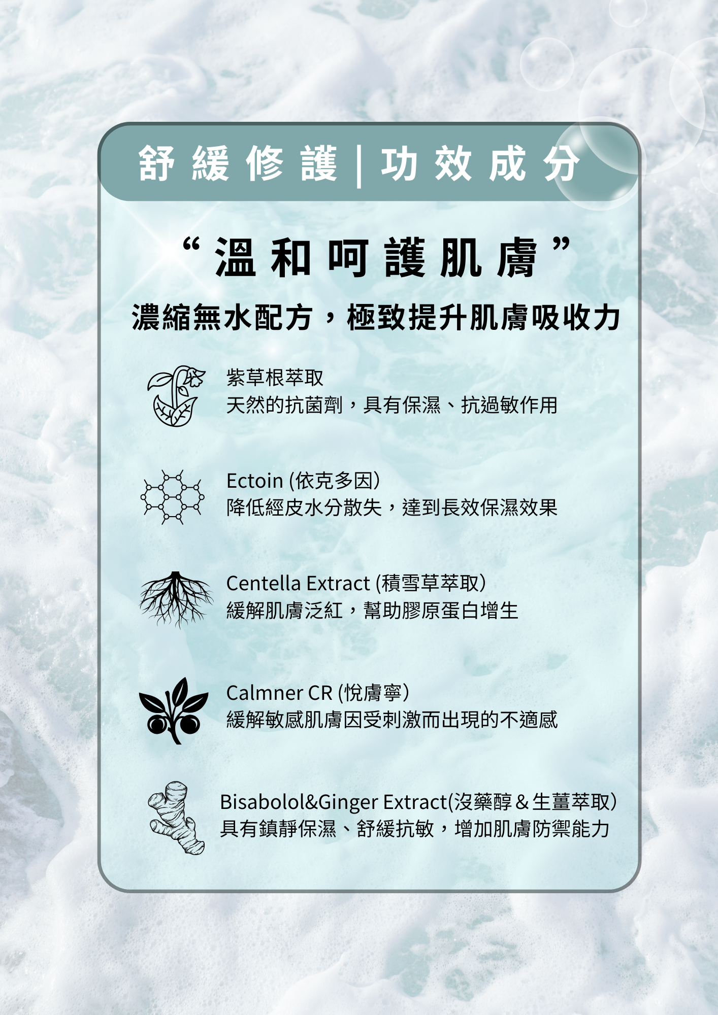 以紫草根、積雪草、生薑萃取,來達到優秀的舒緩及癒合功效